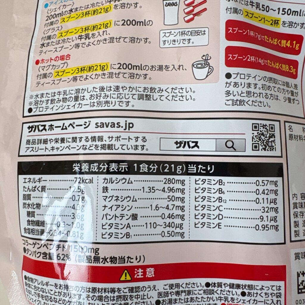 1杯のたんぱく質量が12.5gと一般的なプロテインと比べるとやや少なめですが、1杯あたりに必要な粉末量が21gと元々少ない点と、コラーゲン、ビタミン類も摂れることを考えればお得に感じました。何より美味しいので続けられる。